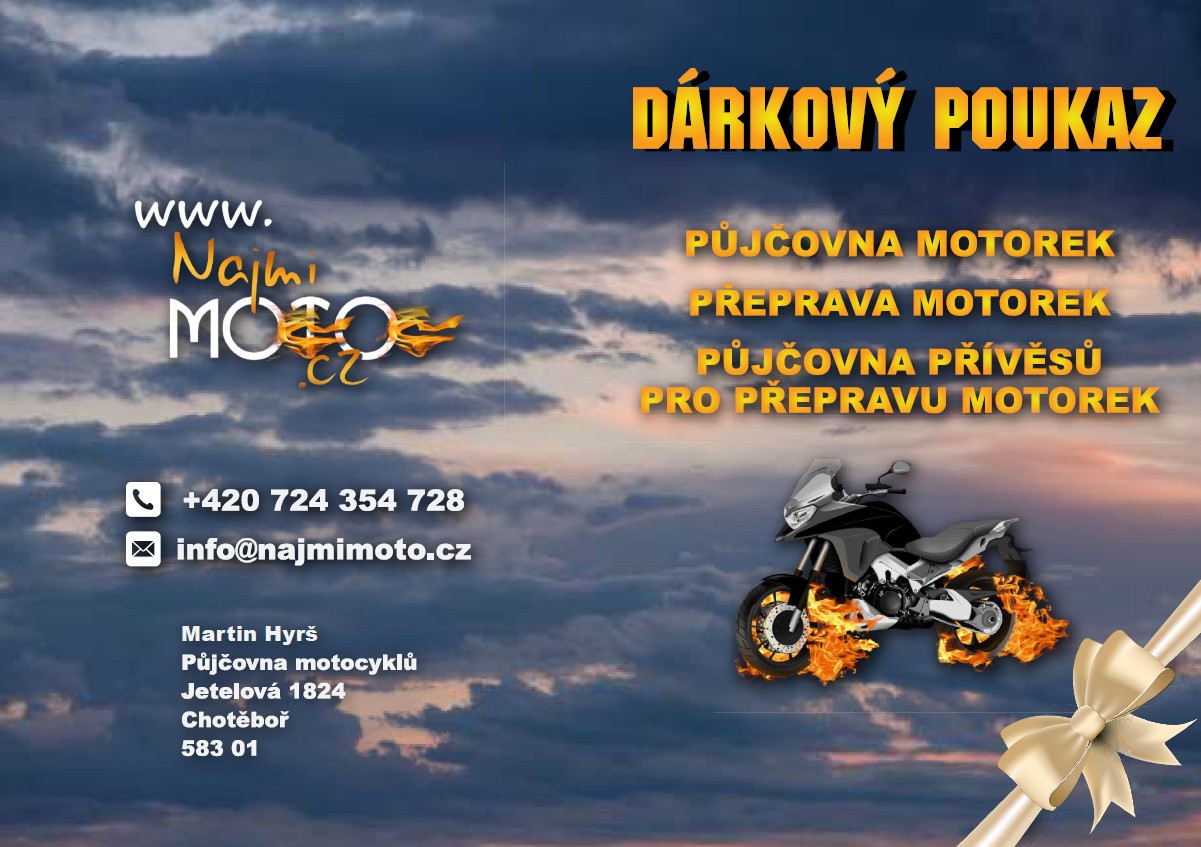 Chceš-li někomu udělat radost tímto dárkem, zavolej na tel: +420 724 354 728, nebo napiš na info@najmimoto.cz a domluv si, jak má tvůj poukaz vypadat.
